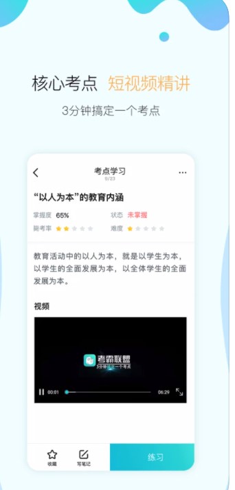 1.3分钟搞定考点:新增功能短视频模块,专业的内容开发者多年来按照考点规则打磨了大部分主要考点,带来了独到的分析见解考试。问题。名师讲解,3分钟搞定考点!