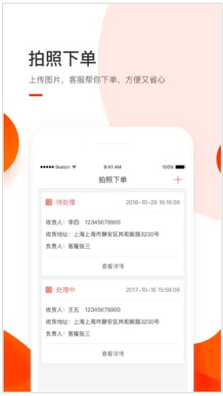3、快速下单,拍照功能。客户登录APP可直接拍照或上传所需商品的图片,完善收货信息后进行提交订单,方便快捷。
