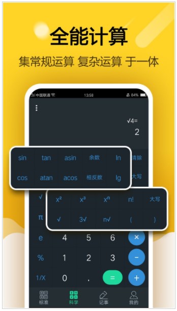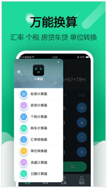 科学计算器,全能语音计算器,解决计算记账难题,工作学习事半功倍!集计算器、科学计算器、分数计算器、汇率换算、个税计算器、房贷计算器、车贷计算器、五险一金、日期计算器、进制转换、理财计算、自定义公式、单位换算、亲戚计算器、日常记账、备忘录等为一体,无限条存储历史记录,功能强大,方便好用,完美作业帮手,简单解决各种计算、换算的超级计算器。
