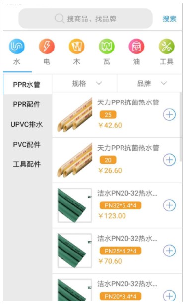 在这里您可以选择任何种类的辅助材料,如水、电、瓦油和家居装饰工具;