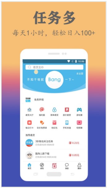 1、子凡帮app有丰富多样的任务类型,一起每天赚点零花钱,每日赚点红包钱。