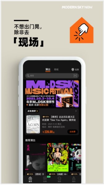 摩登天空音乐节、草莓音乐节、五百里音乐节,全国各大Livehouse演出、音乐人巡演等精彩现场想看就看,门票想买就买。你可以通过正在现场直播自己的演出,也可以申请成为正在现场音乐人,登上草莓音乐节,甚至签约摩登天空。这里有不一样的音乐与现场,和更加不一样的你。