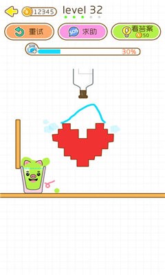 划线解谜,关卡破解。你需要划一条线,让酒瓶中的酒流入酒杯。然后合成一杯风味绝佳的鸡尾酒。划线要精准,不然水流会很快流失。