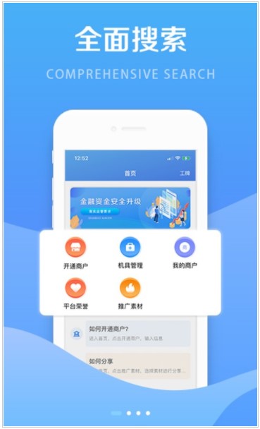 钱创客是代理商展业管理APP,集合众多优秀特性于一身,一站式管理相关业务。方便各类型经营者进入无缝切换式的管理,例如商户进件、商户管理、机具管理,交易查询等等,改变了传统代理商的管理模式,融合了互联网分享经济模式,实现业务快速拓展。