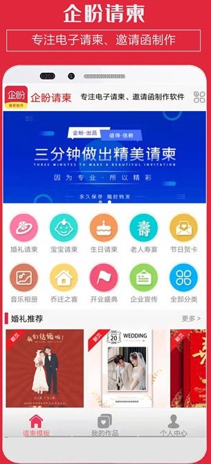 企盼请柬是款简单又专业的电子请柬制作软件,提供婚礼电子请帖、婚宴邀请函、结婚请柬、宝宝满月请柬、生日邀请函、开业请柬,升学宴、老人寿宴、乔迁、同学聚会、各类电子贺卡、电子相册等制作的APP应用。