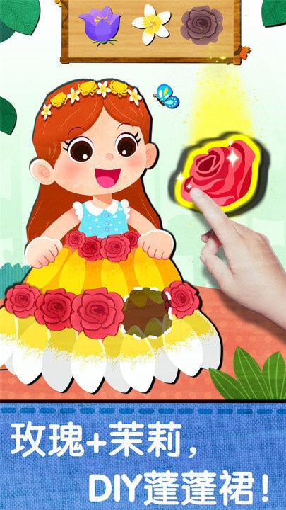 为公主装饰裙子啦。挑选玫瑰、茉莉花拼在裙摆,设计鲜花裙。可以用鸡蛋花和菊花来拼贴裙子吗?宝宝发挥创意,拼拼看~