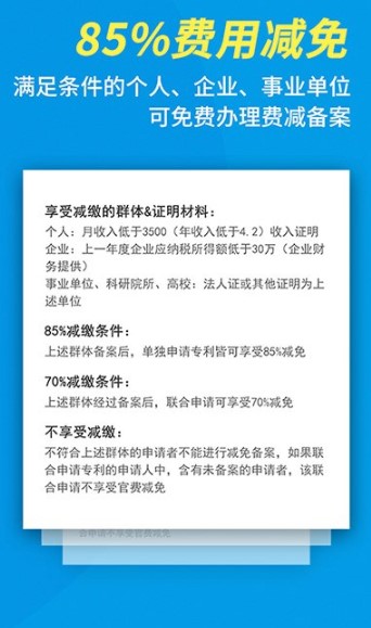 【费减备案】向国家专利局提交专利申请等费用的减免缴费请求。包括:申请费、实质审查费、自授权当年起的10年专利年费