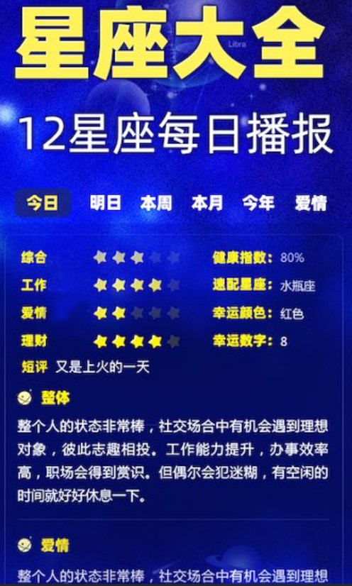*星座运势:全面解析你的每日星座运势,帮你了解12星座的每日,每周,每月的运势变化。