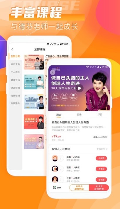 张德芬老师、卢熤翎老师等国内外名师亲临,为您打造丰富的个人成长课程。