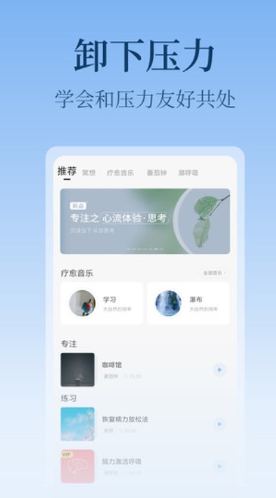 实用主义:四大压力场景:放松、舒眠、静心及振奋;3种人声+23种氛围音乐+7种脑波音乐+独立控制,超实用的视觉型呼吸学习方式;