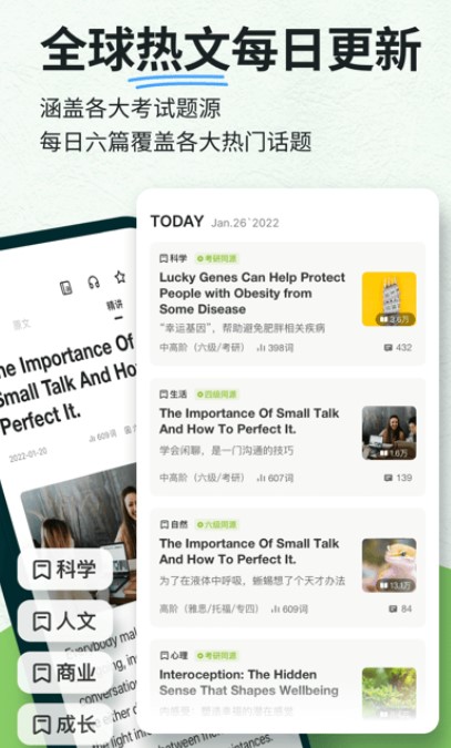 扇贝阅读APP是是以阅读方式学习英语的软件,每日经文高质量的英语短文,感受海外世界,智能定制你的学习计划,制定每日打卡的方式激励你的英语进步。