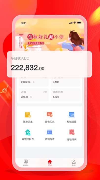火店宝APP以门店收银管理为主,为门店开辟全新的SaaS数字化服务平台。BOSS随时随地可以查看收益汇总数据、收银员收款报告、终端收款报告、连锁报告、专网锁客、流量收益等。