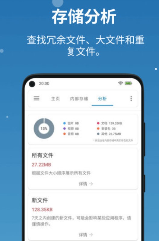 分析内部存储,整理空文件、空文件夹、日志文件、临时文件、缓存文件,重复文件和大容量文件,释放存储空间,检查文件夹大小和占用率。