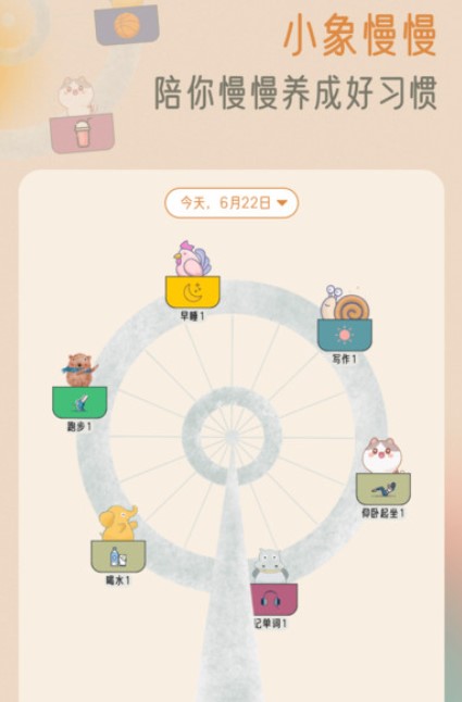 小象慢慢APP是习惯养成类的应用程序,界面非常可爱。 小象慢慢APP采用摩天轮元素制作,用户可以自由添加各种习惯,每天打卡完成进度,可以更换更多的摩天轮。
