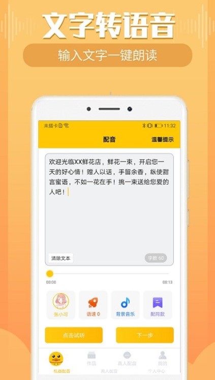配音鸭文字转语音APP是一款免费的文字配音的应用程序,可以更好地使用它们,配音鸭文字转语音APP拥有专业的技术配音,可以自由组合,还可以在这里使用其功能方式,赶紧下载试试吧。