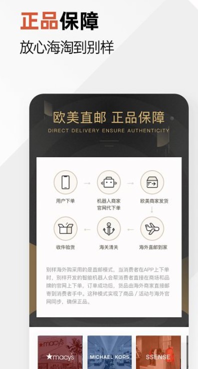 海外购,全程包关税、无差价的全球购;同时我们也是直邮模式,当消费者在APP上下单时,开发的智能机器人会帮消费者直接在商场和品牌的官网上下单,订单成功后,货品由海外商家直接邮寄到消费者手中。这种模式实现了商品活动、价格与海外官网同步,确保正品。