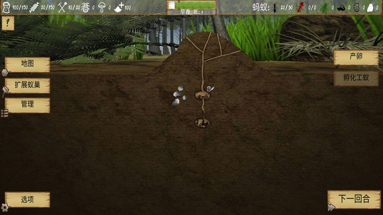 蚂蚁搬家是一款无情的回合生存建筑游戏。只有几只工蚁和一只蚁后的蚁群。你的目标是把你的巢养得足够大,可以孵化并维持足够的资源来建立一个新的殖民地。