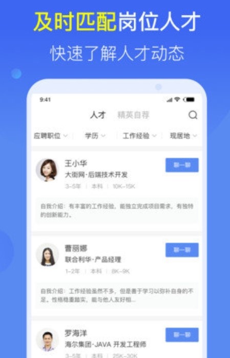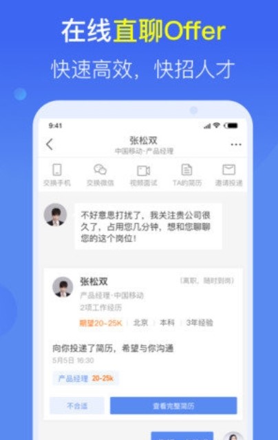 1.全新招聘形式,直聊心仪的行业大咖,代替线下的意向沟通
