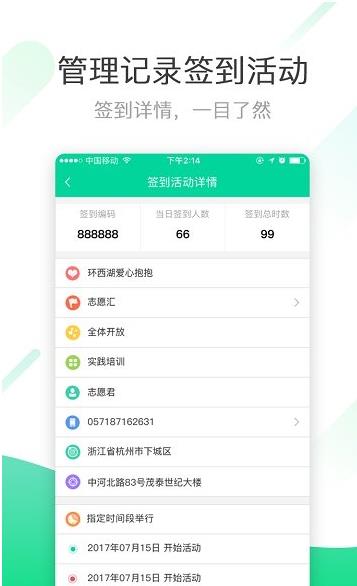 签到活动:创建签到活动,通过审核后,便可对志愿者的签到签退进行记录;