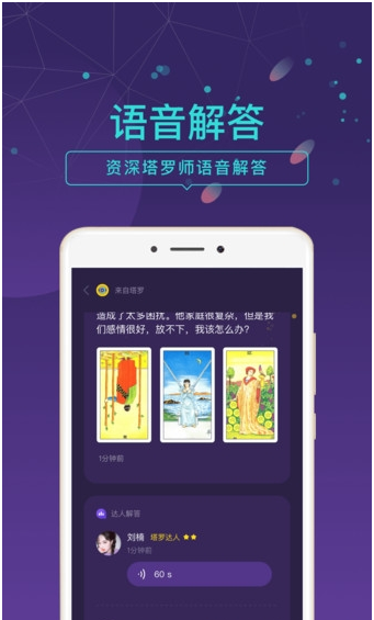 问问塔罗app以塔罗牌为基础,通过它,用户可以与塔罗大师进行沟通,随意的倾诉随机的一些问题和苦恼,让塔罗牌帮您预测,同时还能语音解答,在隐私方面也不用担心,同时解答也非常的迅速,一条语音至少有两个解释回答。
