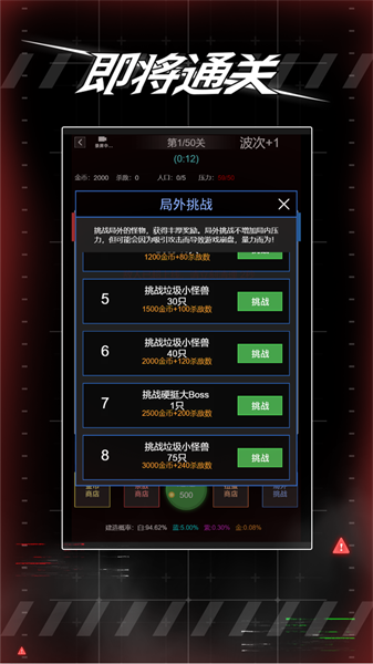 《即将通关》是一款随机塔防游戏,在每一次随机建塔和随机技能中,分配资源、选择培养、调整战术、爽快塔防、即将通关!