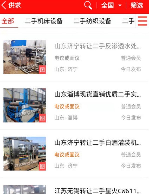 二手设备:包装设备、工程机械、机床设备、工业锅炉、塑料设备、纺织设备、化工设备、木工机械、印刷机、造纸机、发电机、旧变压器、农业机械、建材设备、仪器仪表、矿山机械、服装设备、食品机械、行车等工业类闲置设备行业。