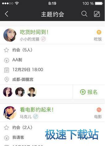 主题约会功能个人觉得是么么哒最实用的一个功能,只要在发布界面选择你想发布的活动及地点人数,就可以创建约会。当然你也可以实时发现别人的约会,并且点击参与。