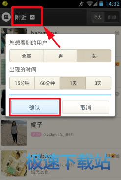 2)点击界面左上角的“附近”,会弹出选项,在这里你可以选择查找附近的人的性别和最近上线的时间间隔,然后选择你想要加的人进行关注。(如下图所示)