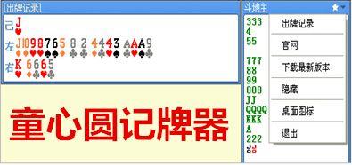 童心圆记牌器是一款可以帮助玩家显示出牌记录的游戏辅助,童心圆记牌器可以用于各大棋牌类游戏大厅中的牌类游戏记牌。主要用于够级游戏的记录。玩家只需先打开这款记牌器,然后进入任何棋牌游戏即可记录当时的出牌。