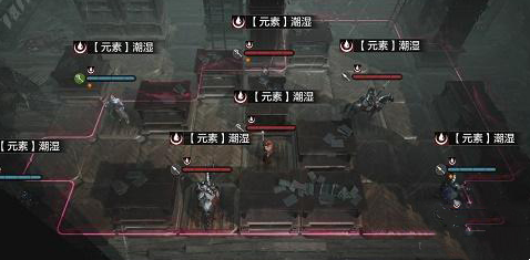 2、选择毒法,使用技能。目标是敌人的治疗者。由于场景有潮湿效果,毒法的毒元素与潮湿(水元素)效果叠加,会导致敌人获得感染debuff,感染会使敌人无法获得增益和治愈效果。毒技能范围很广,下图中的枪手和治疗者都可以施加感染debuff。