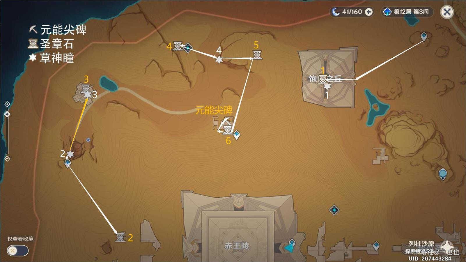 图中黄色路线为地下路线,白色路线为地上路线。传送上图锚点,往地图的西南方向走,前往饱饮之丘。往地图的西方向走,前往图中圣显棱柱位置,具体的路线可以参考上图的标记一个个寻找。