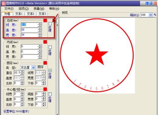外线/内线:图章、椭圆章、方章、菱形章、三角章等都是通过外框效果形成,外框粗细通边[线宽]做调整(为0时无边框)。