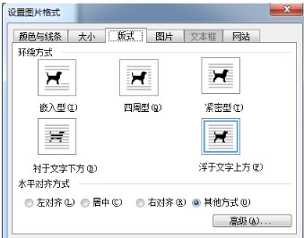 3、双击刚插入的图片(或者选中图片后点右键-[设置图片格式]);在弹出的窗口中选[版式]项,将环绕方式改为[浮于文字上方]或者[浮于文字下方]。