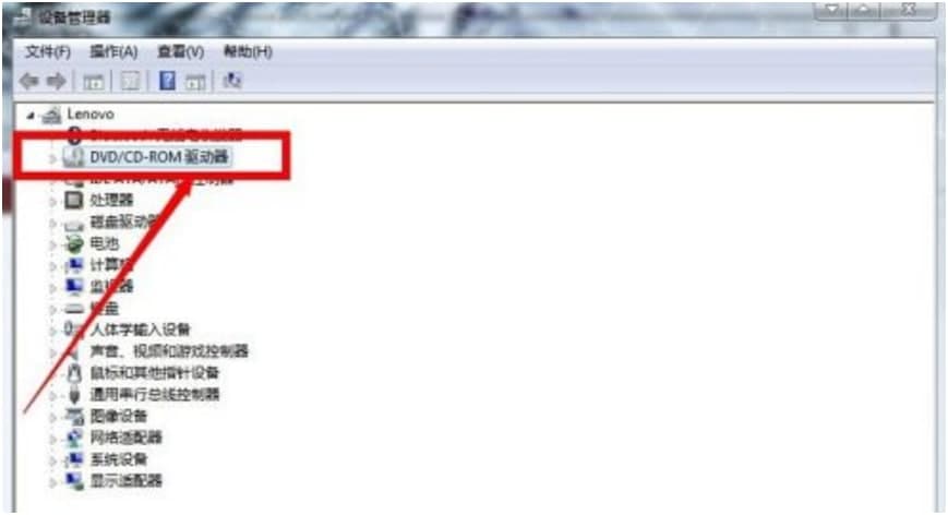 在打开的”设备管理器“对话框中单击”DVD/CD-ROM“前面的小三角形。