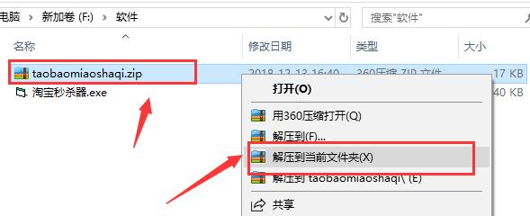 可以下载淘宝秒杀的压缩包,然后鼠标右键点击压缩包,选择解压到当前的文件夹。