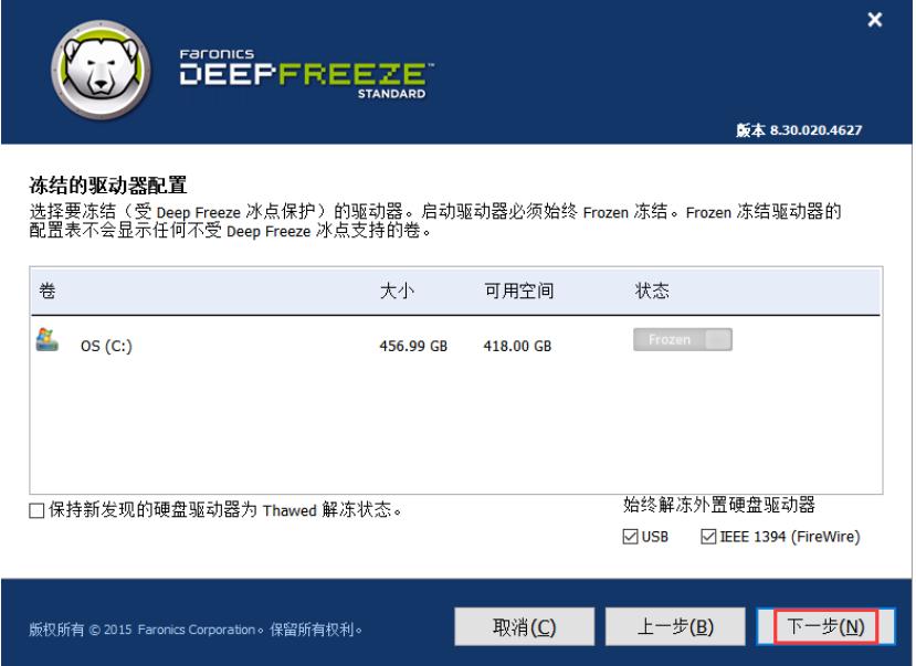 4.接下来进入冰点还原精灵冻结的驱动器配置界面,我们可以直接点击下一步。