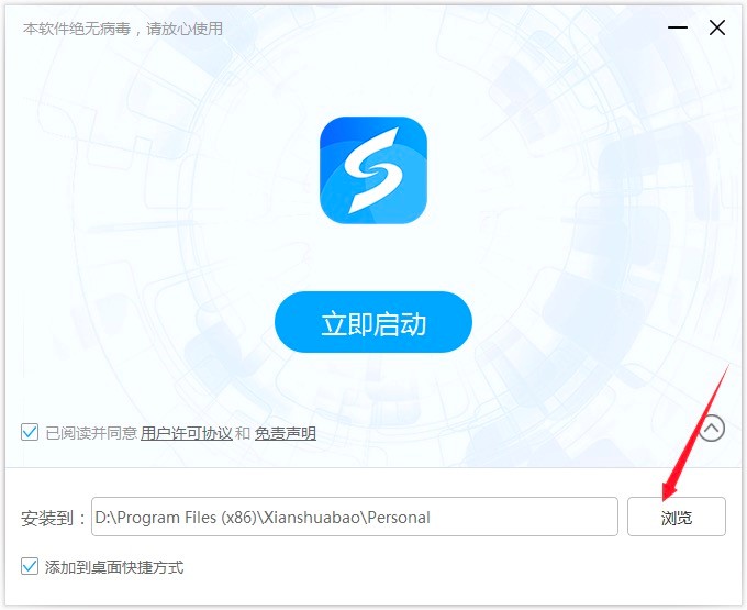 3. 在软件安装的页面中,在安装路径一栏中,点击“浏览”按钮之后就能够选择其他的安装位置进行软件的安装。同时还有添加到桌面快捷方式的选项,自定义点击选择之后,就能够点击页面中的“立即启动”的按钮,进行该软件的安装。