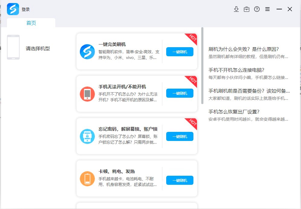 3. 打开软件到主页面之后,我们需要根据需要刷机的对应机型,同时还需要选择需要解决的手机问题方案。这个时候软件就能够根据我们选择的解决问题方案,就会自动下载所需要的固件资源包,同时还会自动的解析刷机包进行使用。