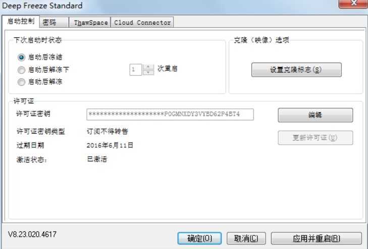 3.输入密码后,弹出冰点的用户界面。在启动控制状态下,我们有三种选择。如果我们决定恢复计算机,我们选择在启动后将其冻结。