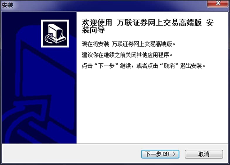 1、用户首先在本站将万联证券网上交易高端版的软件包下载下来,对其安装包并解压,到当前文件夹中,点击其中的.exe应用程序,根据提示进入安装向导界面,点击下一步继续。