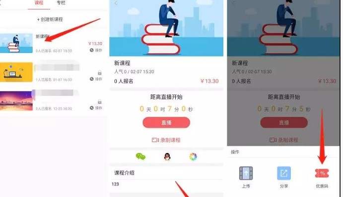 1.新课上线:刚推出一节线上课程利用优惠码吸引更多新用户加入,达到快速吸粉的效果。