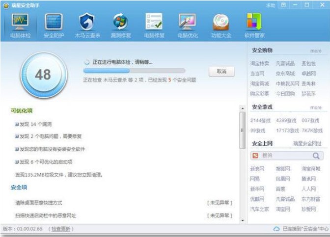 瑞星安全助手从《瑞星卡卡网络会计信息质量安全助手》升级开发而来,具有“专业、轻巧、干净”三个特点,通过这样一个全新的UI界面,可以进行分析设计和引擎代码重写,相对对于用户能够提供一套上网安全教育技术作为辅助课堂教学活动方案,包括学习一些漏洞修复、数据加密、系统垃圾清理等七大类近百项功能。瑞星安全助手是一款完全免费的软件,解决了国内目前针对中小企业的用户在使用计算机系统开发工作中遇到的各种疑难杂症的安全信息技术辅助类免费软件。瑞星安全助手Beta共有八个功能模块,包括“电脑体检”、“木马云查杀”、“漏洞修复”、“计算机优化”、“瑞星云安全”、“高级工具”和“全部功能”。