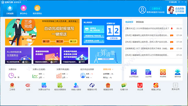 你通过金财助手,可以实现国税地税申报、文书、发票、个税、查询等全业务在线轻松办理,你无需来回切换账户,真正做到一个平台办理全税种申报