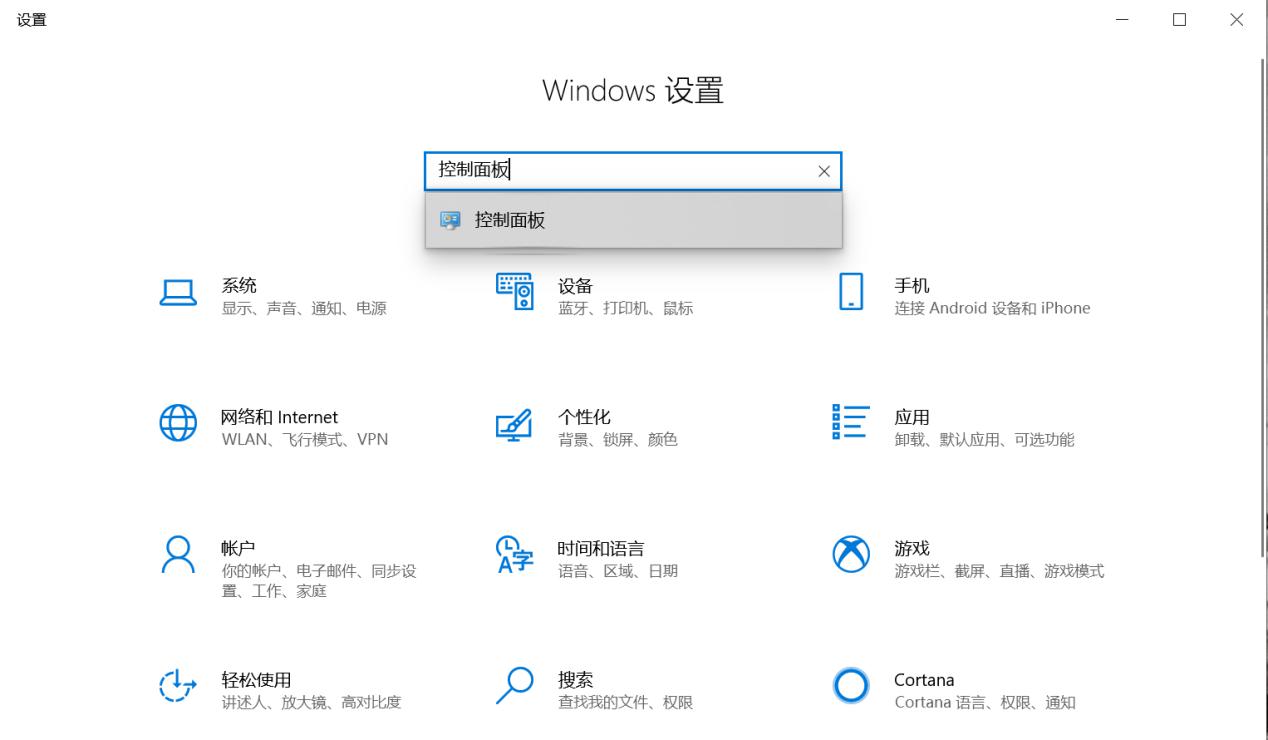 2、单击设置后,会弹出系统设置页面,我们在顶部搜索框中输入“控制面板”,并点击下方出现的控制面板按钮,如下图
