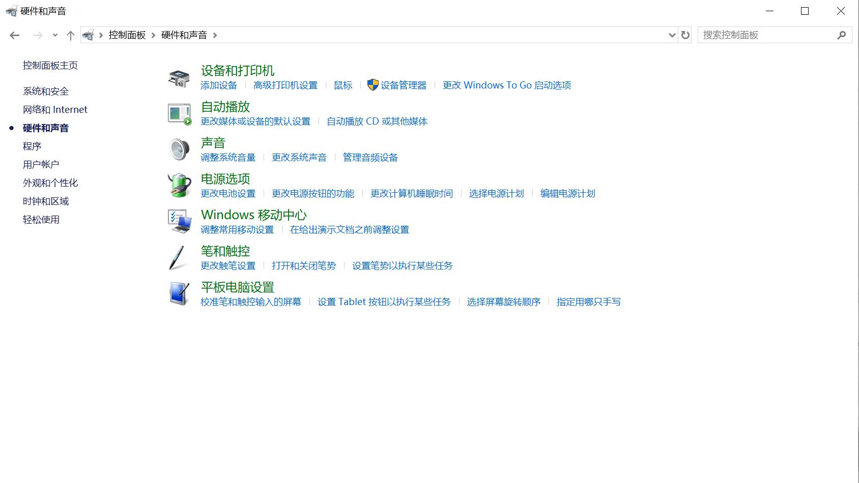 4、在控制面板页,我们点击“硬件和声音”,进入下一页,如下图