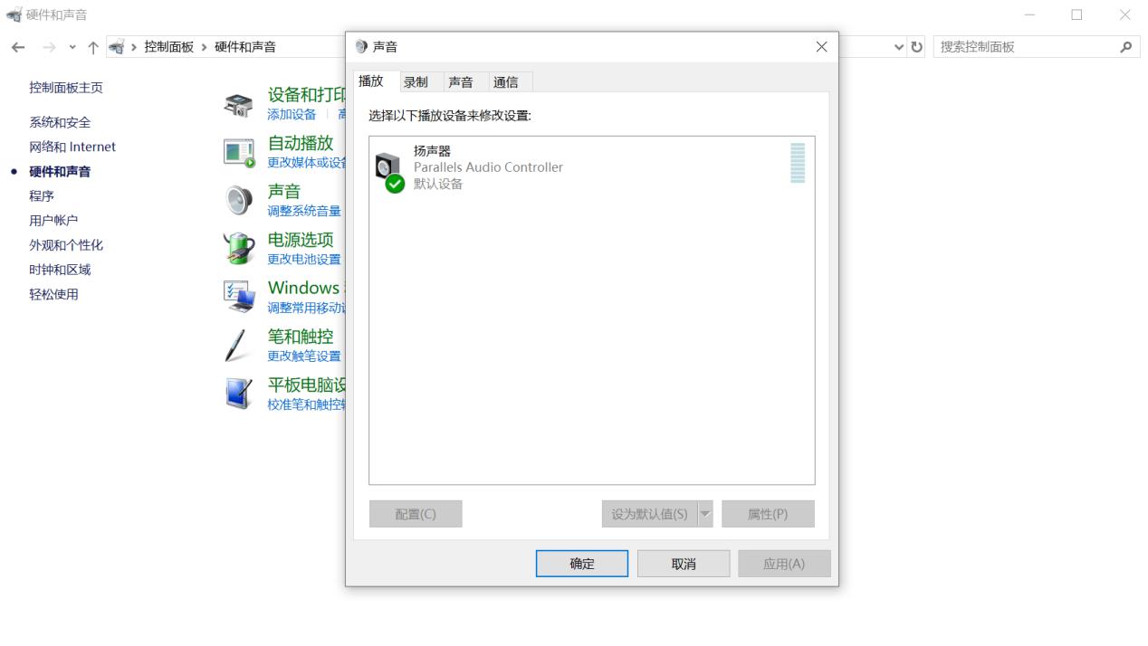 5、点击“声音”,会弹出声音设置的窗口,窗口显示的是你电脑上的声音播放设备,小编的电脑声音播放设备是扬声器,如下图