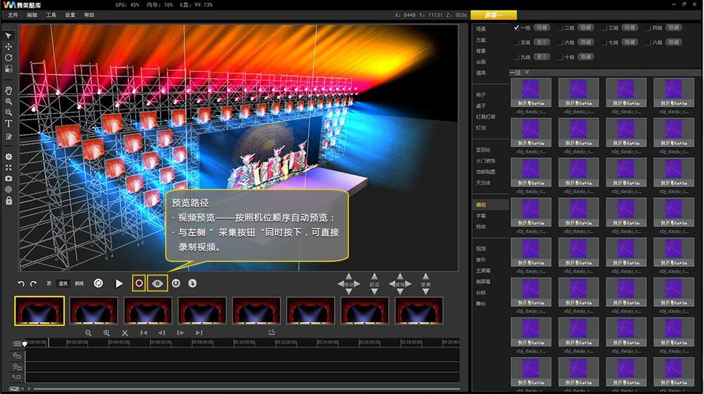 4、高清视频,场景中可以导入动态视频、动态灯光特效 。
