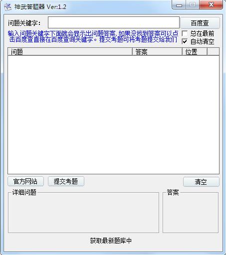 - 软件描述:神武答题器是2014最新神武游戏的神武科举答题器。神武答题器目前题库包含1000... [立即下载]
