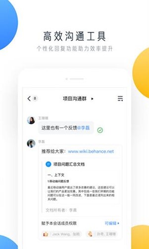 2、多人多平台实时协同编辑,文档内讨论,针对性表达意见,强大的@功能,内容更丰富,省去邮件通知和线下沟通。
