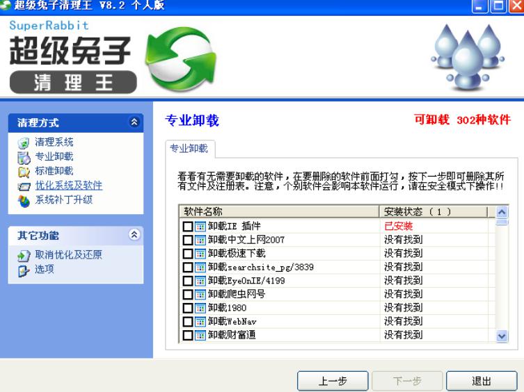 现在,在“专业卸载”选项中你就可以轻松卸载这些程序及IE的插件。此处提供了100种软件的卸载功能,而且还会不断更新。所谓专业卸载,就是从文件到注册表,全部都能完整卸载。